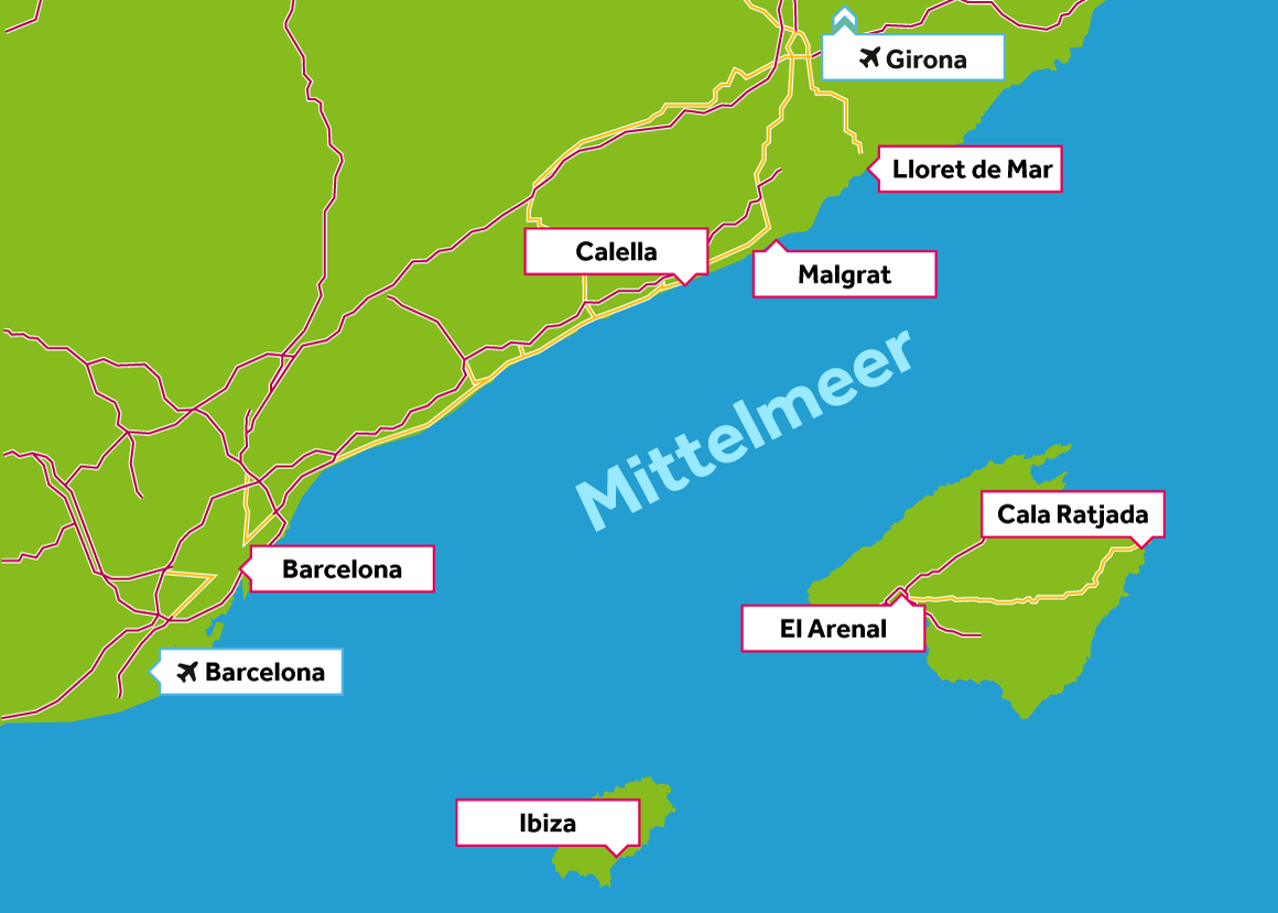 Die einfachste und vor allem auch günstigste Möglichkeit für eine Anreise zu den Urlaubsorten auf dem Festland Spaniens ist der Reisebus. Von vielen deutschen Städten aus starten Reisebusse direkt nach Lloret de Mar, Calella, Malgrat de Mar sowie weitere beliebte Urlaubsorte. Im Gegensatz zur Flugreise muss allerdings bei der Busreise mehr Zeit eingeplant werden, dafür spart man dabei ordentlich Geld! Die Fahrtzeit mit dem Bus ist ganz unterschiedlich, denn es kommt immer darauf an, von welcher Stadt man abfährt und zudem natürlich auch, wie die Verkehrslage ist. Daher kann nicht pauschal gesagt werden, wie lange man unterwegs ist. Von München nach Calella fährt man beispielsweise mit dem Bus ungefähr 15-16 Stunden. Aber auch wenn die Fahrtzeit recht lange ist – es lohnt sich allemal! Die Reisebusse sind zudem modern und gemütlich ausgestattet, so dass auch die lange Fahrtzeit wie im Fluge vergeht und ihr lernt schon vorab eine Menge coole Leute kennen!
